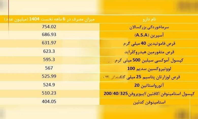 در میان اقلام دارویی، داروی سرماخوردگی بزرگسالان با مصرف ۷۵۴ میلیون عدد در صدر فهرست قرار گرفته است. پس از آن، داروهای آ.اس.آ (ASA)، فاموتیدین، متفورمین، آموکسیسیلین و لووتیروکسین بهترتیب بیشترین میزان مصرف را داشتهاند.